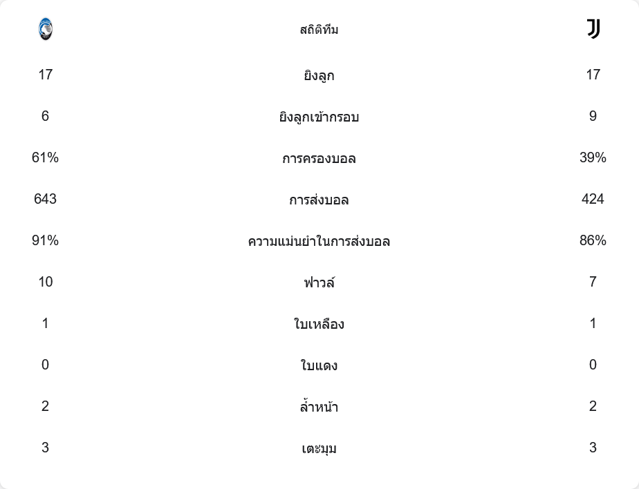 อตาลันต้าครองบอลได้ 61% เทียบกับ 39% ของยูเวนตุส มีโอกาสยิง 17 ครั้งเท่ากัน แต่อตาลันต้ายิงเข้ากรอบ 6 ครั้ง ส่วนยูเวนตุสยิงเข้ากรอบ 9 ครั้ง ความแม่นยำในการส่งบอลของอตาลันต้าดีกว่าเล็กน้อยอยู่ที่ 91%