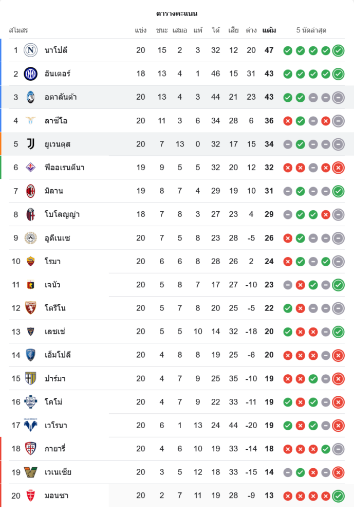 หลังจบเกมนี้ อตาลันต้ารั้งอันดับที่ 3 มี 43 คะแนนจาก 20 นัด ส่วนยูเวนตุสยังคงอยู่อันดับ 5 มี 34 คะแนน