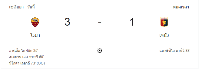 นาทีที่ 73 (GOAL!): โรม่านำห่าง 3-1 จากจังหวะที่นิโคล่า เลอาลี่ (เจนัว) ทำเข้าประตูตัวเองหลังพยายามสกัดบอลจากการยิงของเปาโล ดีบาลา