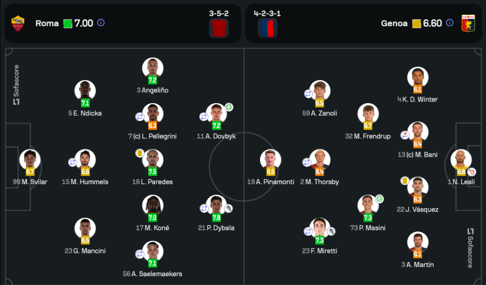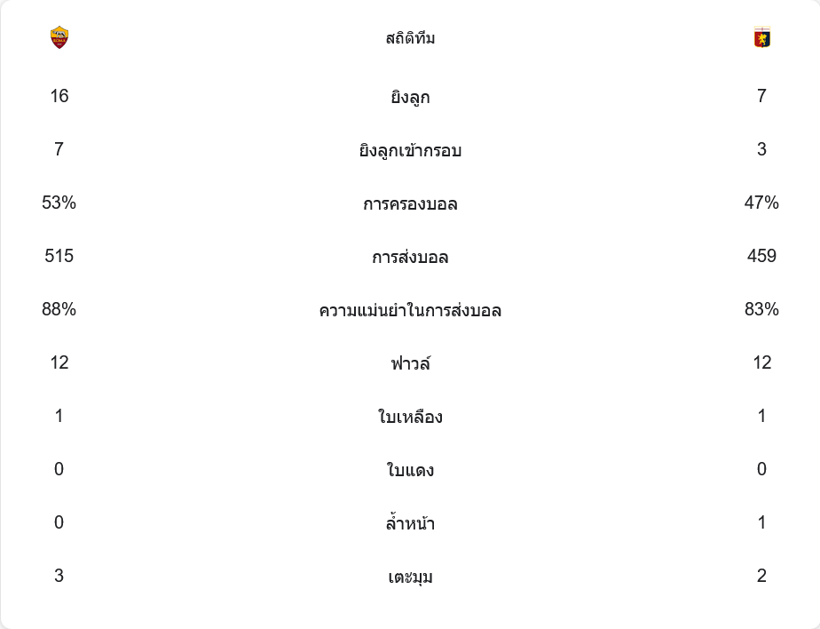 เกมนี้ โรม่าครองบอลได้มากกว่า (53%) และมีโอกาสยิงถึง 16 ครั้ง เทียบกับเจนัวที่ยิงเพียง 7 ครั้ง นอกจากนี้ ความแม่นยำในการผ่านบอลของเจ้าถิ่นสูงถึง 88% ทำให้พวกเขาคุมเกมได้ตลอดทั้งแมตช์