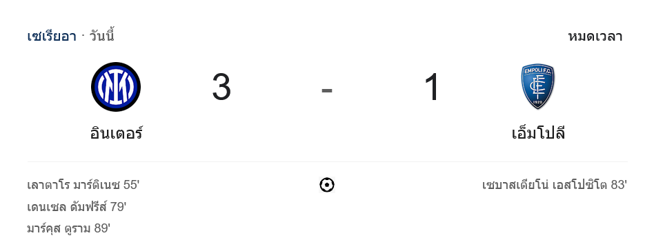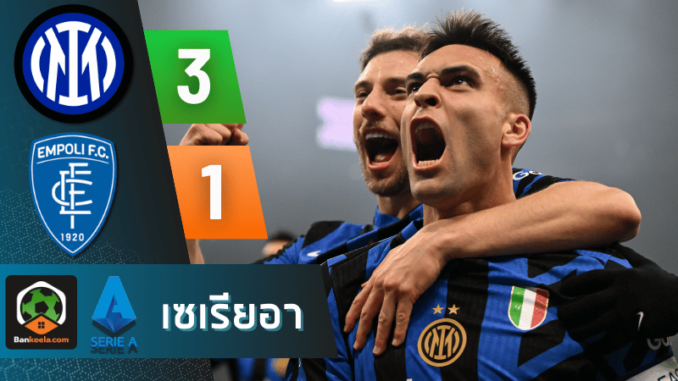 ศึก เซเรียอา 2024 อินเตอร์ มิลาน ยังคงรักษาฟอร์มโหด เปิดรังถล่ม เอ็มโปลี 3-1 เก็บ สามแต้มสำคัญ ไล่ล่าแชมป์แบบไม่มีสะดุด โดยมี เลาตาโร่ มาร์ติเนซ, เดนเซล ดุมฟรีส์ และ มาร์คัส ตูราม ซัดคนละลูก ช่วยให้ “งูใหญ่” ยึดตำแหน่งรองจ่าฝูงแน่นหนา ส่วน เอ็มโปลี แม้จะสู้เต็มที่ แต่แนวรุกยังคงมีปัญหาทำให้ไม่สามารถต้านทานพลังบุกของเจ้าถิ่นได้