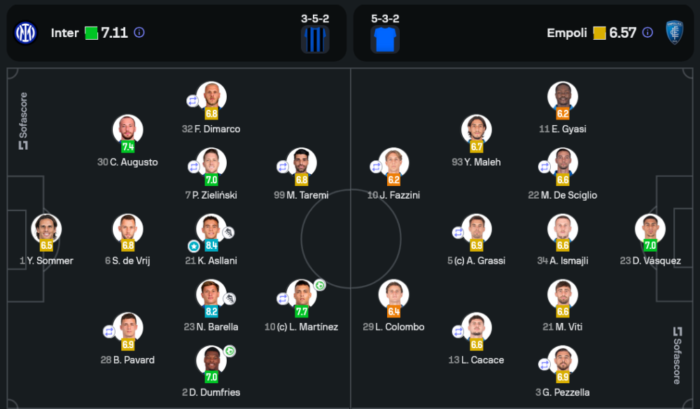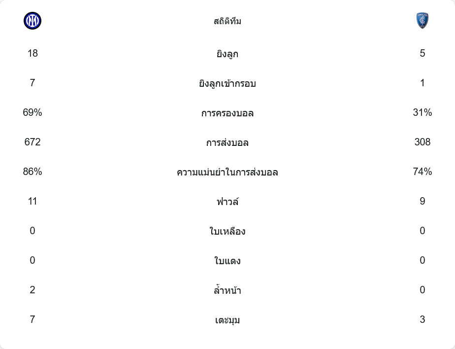 อินเตอร์ ครองบอล 69% เทียบกับ 31% ของเอ็มโปลี และสร้างโอกาสยิงมากถึง 18 ครั้ง โดยเข้ากรอบ 7 ครั้ง ขณะที่ เอ็มโปลี ยิงได้เพียง 5 ครั้ง และเข้ากรอบแค่ 1 ครั้ง แสดงให้เห็นถึงความเหนือกว่าของเจ้าบ้านอย่างชัดเจน