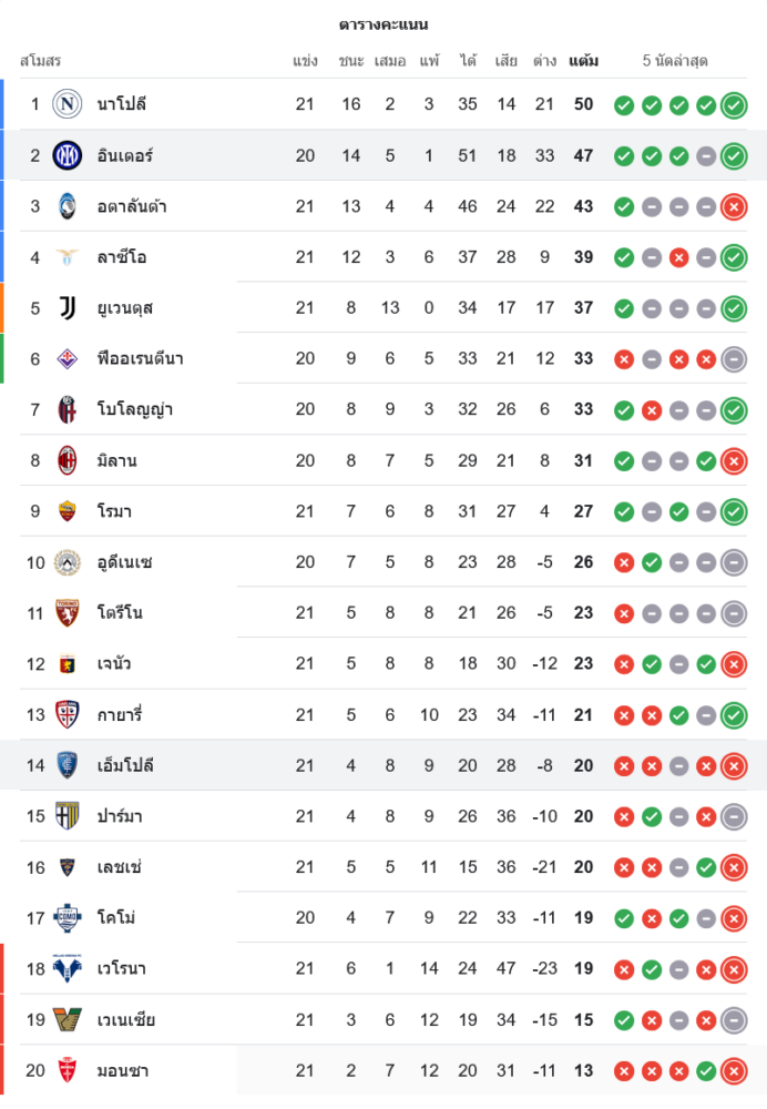 อินเตอร์ มิลาน ยังคงรั้งรองจ่าฝูงด้วย 47 คะแนน ตามหลัง นาโปลี 3 แต้ม ขณะที่ เอ็มโปลี รั้งอันดับที่ 14 มีเพียง 20 คะแนน ใกล้โซนตกชั้น ต้องเร่งฟอร์มหากไม่ต้องการดิ้นรนหนีตกชั้นในช่วงท้ายฤดูกาล
