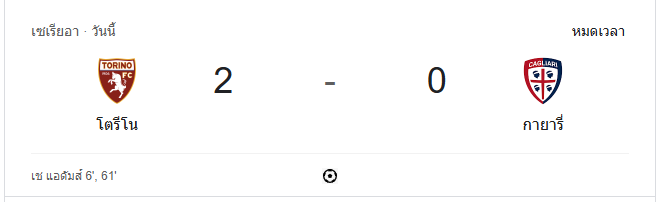ผลบอลสด เซเรียอา 2024 ระหว่าง โตริโน่ 2-0 กาญารี่ วันนี้ 25/1/68