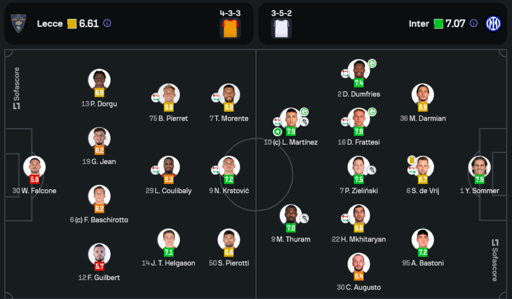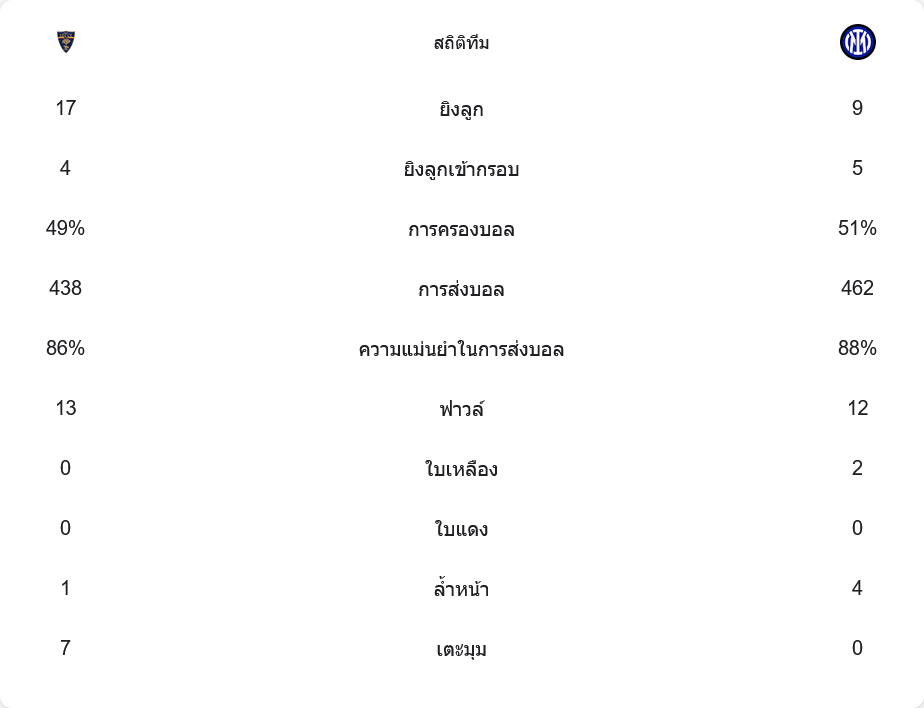 ด้าน เลชเช่ ใช้แผน 4-3-3 หวังใช้เกมริมเส้นเข้าทำ แต่ขาดความเฉียบคม โดยเฉพาะแดนกลางที่ต่อบอลสู้ไม่ได้ ขณะที่แนวรับเจอปัญหาหนักรับมือกับเกมรุกดุดันของอินเตอร์ไม่ไหว ทำให้โดนทะลวงถึง 4 ประตู วิเคราะห์บอล จากเกมนี้ชี้ชัดว่า อินเตอร์ มีมาตรฐานที่เหนือกว่าทุกด้าน ทั้งเกมรุกและเกมรับ