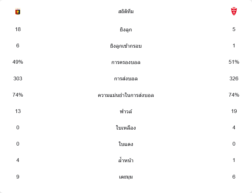 รูปเกมโดยรวม เจนัวครองบอลน้อยกว่าที่ 49% แต่สร้างโอกาสได้มากกว่าด้วยการยิง 18 ครั้ง และเข้ากรอบ 6 ครั้ง ในขณะที่ มอนซ่า ยิงเพียง 5 ครั้ง และเข้ากรอบแค่ 1 ครั้ง ซึ่งแสดงให้เห็นถึงปัญหาในเกมรุกของพวกเขา