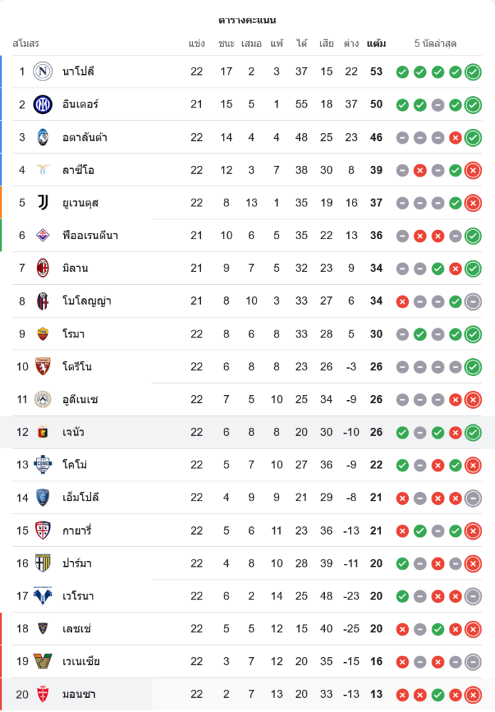 หลังจบเกมนี้ เจนัว ขยับขึ้นมาอยู่อันดับ 12 มี 26 แต้ม จาก 22 นัด เริ่มมีความมั่นใจมากขึ้นในการลุ้นอันดับกลางตาราง ขณะที่ มอนซ่า ยังคงจมบ๊วย มีเพียง 13 แต้ม ต้องเร่งเครื่องอย่างหนักหากหวังหนีตกชั้น