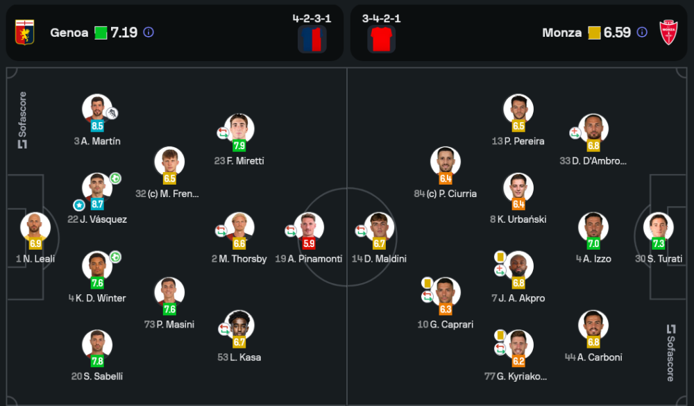 เจนัวมาในระบบ 4-2-3-1 ที่เน้นการโจมตีจากริมเส้นและการครองบอลกลางสนาม ขณะที่มอนซ่าเลือกใช้ 3-4-2-1 โดยมีมิดฟิลด์ตัวรับสองคนช่วยป้องกันแนวหลัง