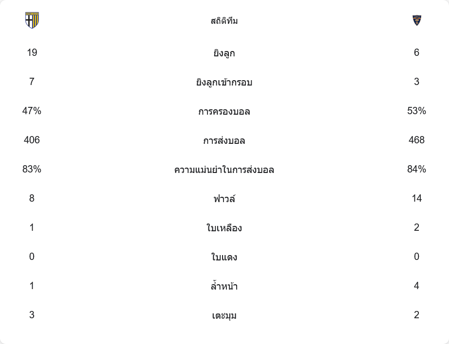 แม้ว่าปาร์ม่าจะมีโอกาสยิงมากกว่า (19 ครั้ง) และครองบอลได้ 47% แต่เลชเช่กลับใช้โอกาสเพียง 6 ครั้งได้อย่างมีประสิทธิภาพ ยิงเข้ากรอบ 3 ครั้งและเป็นประตูทั้งหมด การจ่ายบอลของเลชเช่มีความแม่นยำสูงถึง 84% จากจำนวน 468 ครั้ง ในขณะที่ปาร์ม่าจ่ายบอล 406 ครั้ง แม่นยำ 83% การฟาวล์ของเลชเช่มีมากถึง 14 ครั้ง สะท้อนถึงเกมรับที่เน้นการตัดเกมคู่แข่งอย่างดุดัน
