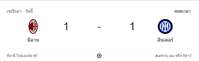 นาทีที่ 96: กรรมการเป่านกหวีดจบเกม เอซี มิลานเสมออินเตอร์ มิลาน 1-1