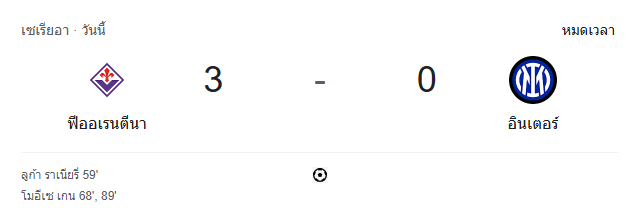 - นาทีที่ 98 กรรมการเป่านกหวีดจบเกม ฟิออเรนติน่าถล่มอินเตอร์ มิลาน 3-0