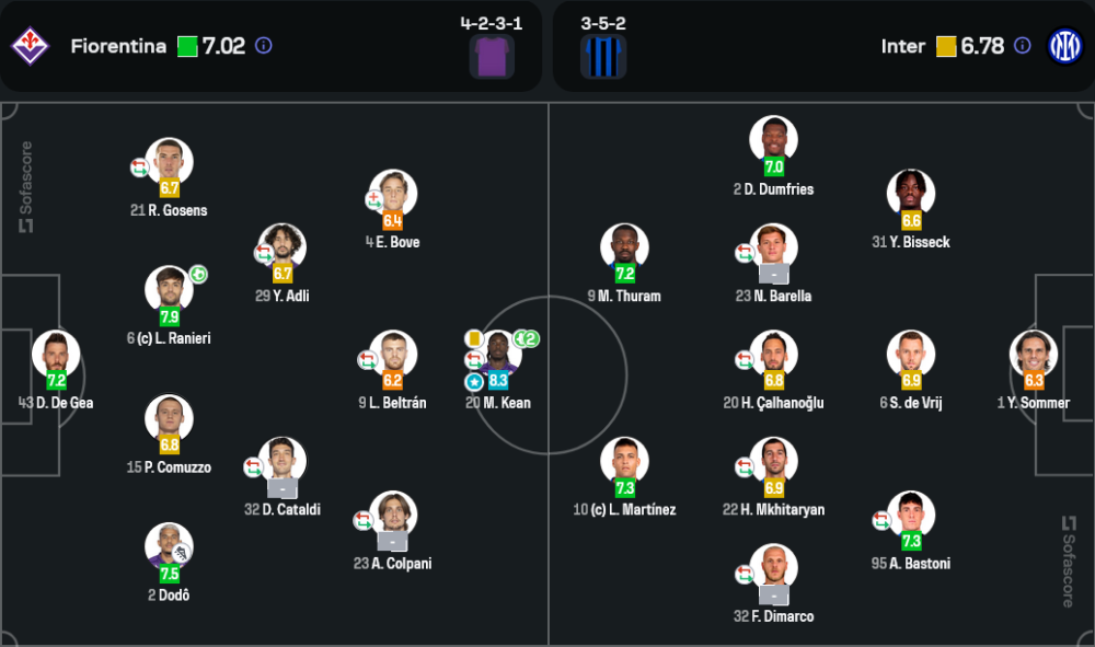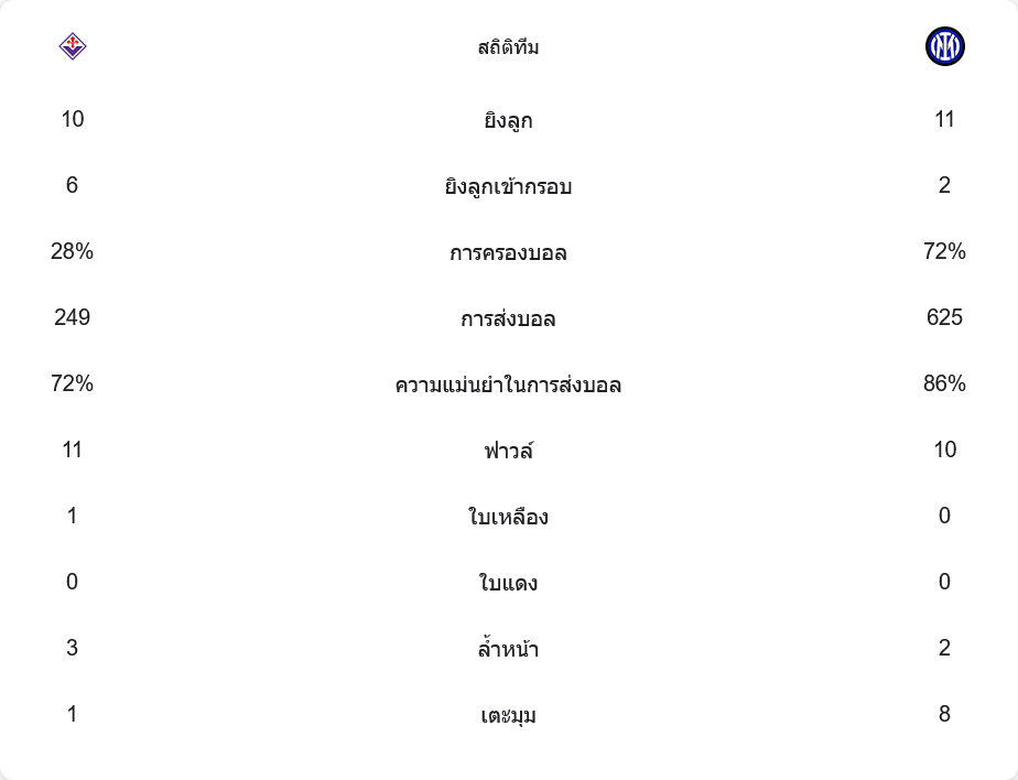 แม้ว่าฟิออเรนติน่าจะเป็นฝ่ายชนะไป 3-0 แต่พวกเขาครองบอลเพียง 28% และมีโอกาสยิง 10 ครั้ง โดยเข้ากรอบ 6 ครั้ง ขณะที่ อินเตอร์ มิลาน ครองบอลถึง 72% และมีโอกาสยิง 11 ครั้ง แต่กลับยิงเข้ากรอบเพียง 2 ครั้ง ทีมเยือนผ่านบอลมากถึง 625 ครั้ง เทียบกับเจ้าบ้านที่ส่งบอลได้เพียง 249 ครั้ง ความแม่นยำในการผ่านบอลของอินเตอร์อยู่ที่ 86% ส่วนฟิออเรนติน่าแม่นยำ 72% การเล่นที่รัดกุมของเจ้าบ้านทำให้พวกเขาทำฟาวล์ถึง 11 ครั้ง และได้รับใบเหลือง 1 ใบ ขณะที่ อินเตอร์ ทำฟาวล์ 10 ครั้ง โดยไม่มีใบเหลืองเลย ทีมเยือนยังได้เตะมุมมากกว่าที่ 8 ครั้ง เทียบกับเจ้าบ้านที่ได้เพียง 1 ครั้ง แต่ไม่สามารถใช้โอกาสเหล่านั้นเปลี่ยนเป็นประตูได้