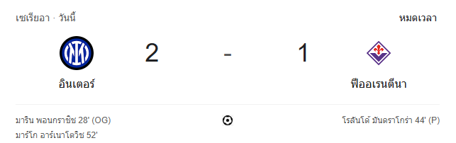 - นาทีที่ 95 กรรมการเป่านกหวีดจบเกม อินเตอร์ มิลานเอาชนะฟิออเรนติน่า 2-1