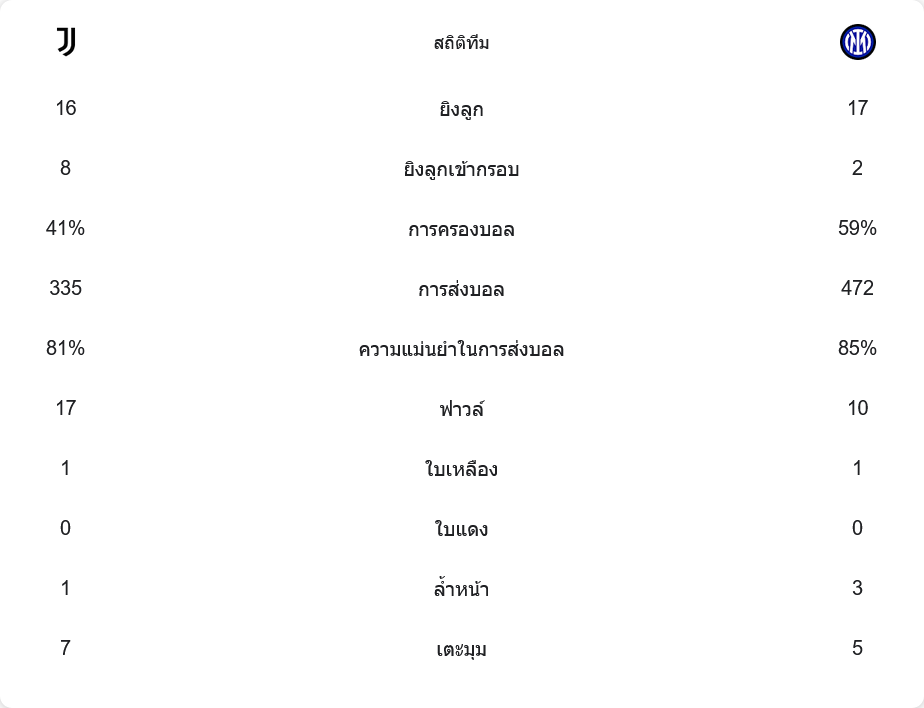 แม้ อินเตอร์ จะครองบอลได้มากกว่า แต่เกมรุกกลับเจาะแนวรับของ ยูเว่ ไม่เข้า ความแม่นยำในการส่งบอลสูงถึง 85% แต่การเข้าทำในพื้นที่สุดท้ายยังขาดความเฉียบคม ขณะที่ ยูเวนตุส อาศัยเกมรับเหนียวแน่นและสวนกลับเร็ว โดยเฉพาะการยิงไกลที่เป็นจุดเปลี่ยนสำคัญของเกมนี้ หากมองตาม วิเคราะห์บอล แท็กติกของ มัสซิมิเลียโน อัลเลกรี ถือว่าเฉียบขาด ใช้โอกาสไม่เปลือง และเล่นตามแผนอย่างสมบูรณ์แบบ