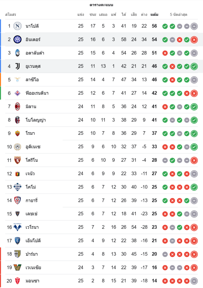 หลังเกมนี้ ยูเวนตุส มี 46 คะแนน อยู่อันดับ 4 ตามหลัง อตาลันต้า อันดับ 3 อยู่ 5 แต้ม ส่วน อินเตอร์ มิลาน พลาดโอกาสทำแต้มไล่จี้ นาโปลี ยังรั้งอันดับ 2 มี 54 คะแนน ตามจ่าฝูงอยู่ 2 แต้ม การลุ้นแชมป์ยังคงเปิดกว้าง