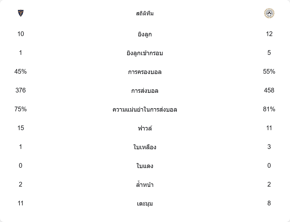 เปอร์เซ็นต์การครองบอล เลชเช่ 45% – อูดิเนเซ่ 55%