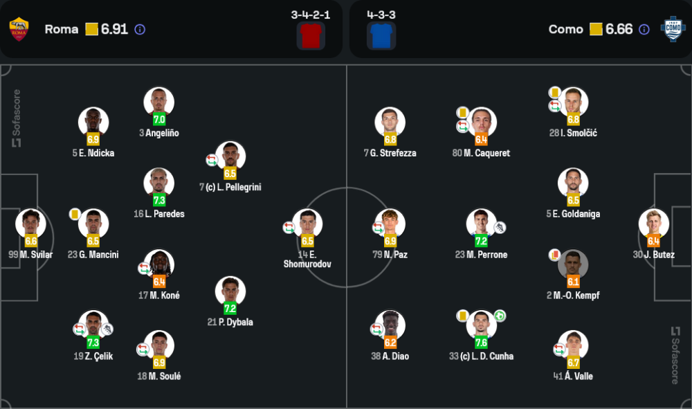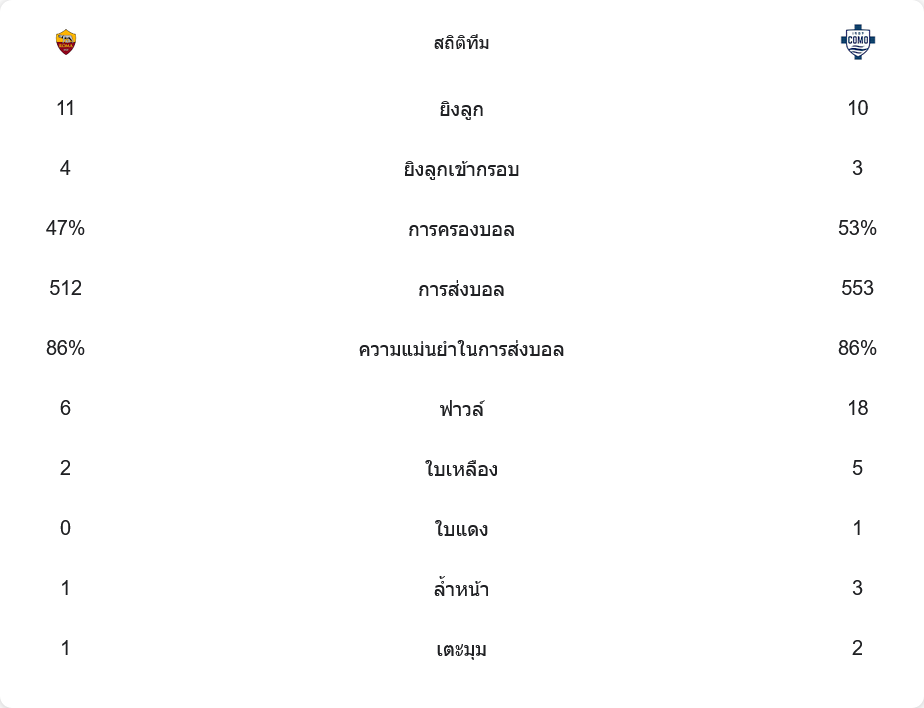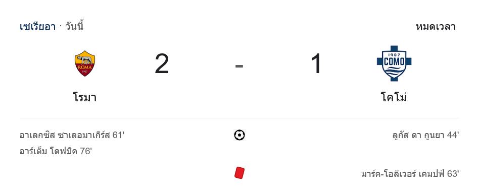 ครึ่งแรก: เกมเปิดตัวอย่างระมัดระวัง แต่โคโมสร้างความช็อกให้เจ้าบ้าน ด้วยประตูขึ้นนำ 1-0 จากการยิงของ ลูกัส ดา คุนญา ในนาทีที่ 44 เกมรับของโรม่าแสดงให้เห็นถึงความหวั่นไหว แม้จะครองบอลได้ใกล้เคียงกัน แต่ไม่สามารถเจาะทะลุแนวรับของโคโมได้ จบครึ่งแรกไปด้วยสกอร์ที่คาดไม่ถึง