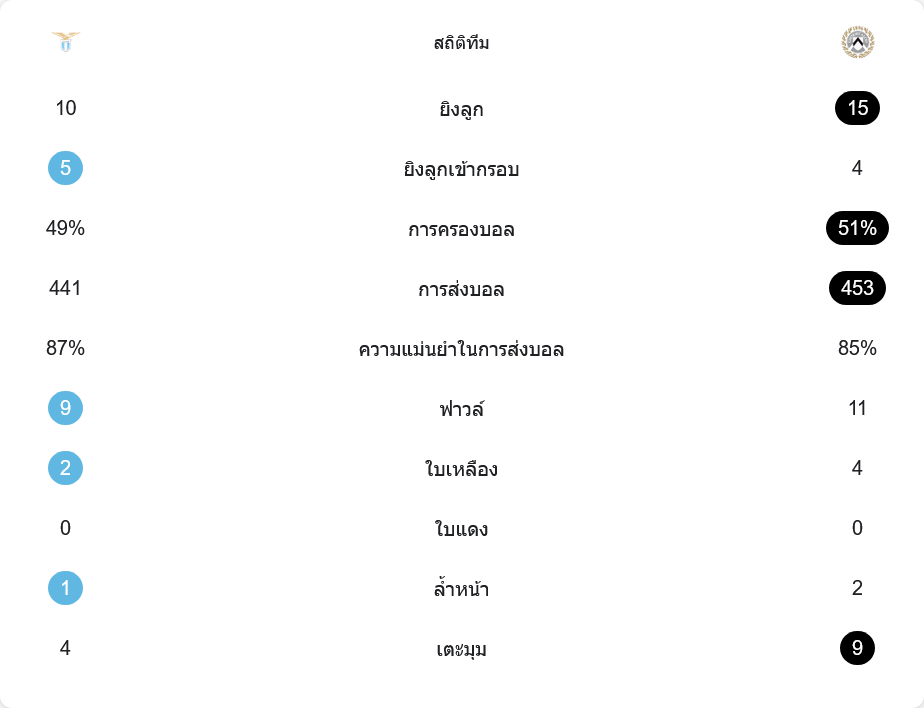 เกมนี้ อูดิเนเซ่ มีโอกาสยิงมากกว่าที่ 15 ครั้ง โดยเข้ากรอบ 4 ครั้ง ขณะที่ ลาซิโอ มีโอกาสยิง 10 ครั้ง และเข้ากรอบ 5 ครั้ง แม้ทีมเยือนจะครองบอลได้มากกว่าเล็กน้อยที่ 51% แต่การจ่ายบอลของทั้งสองทีมแม่นยำสูงถึง 85% และ 87% ตามลำดับ
