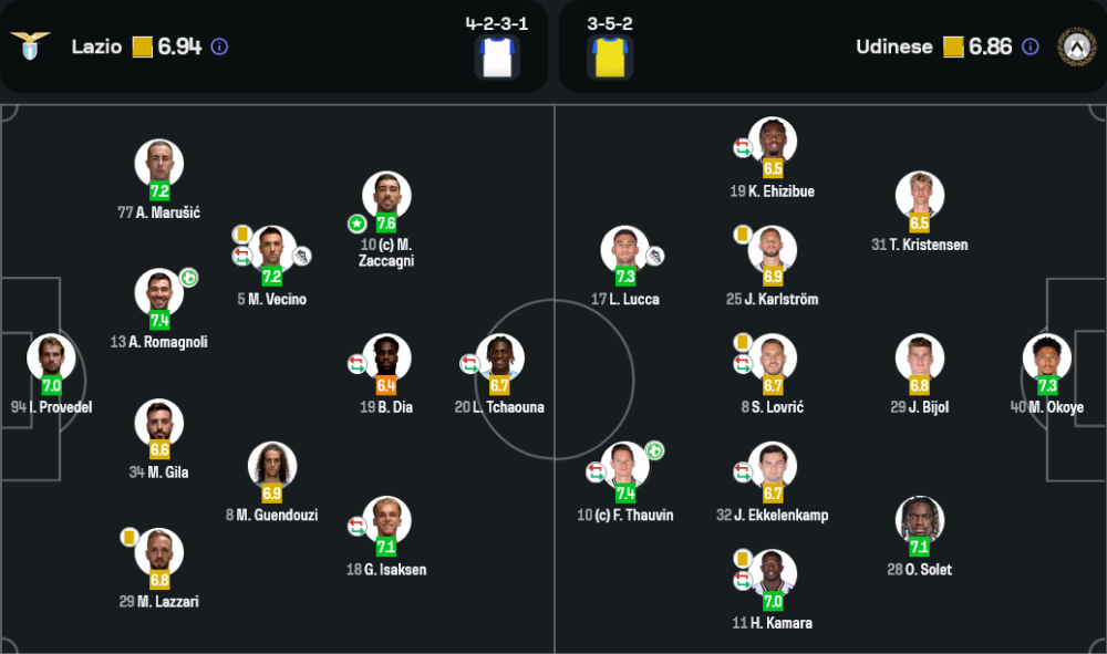 มัตเตีย ซัคคาญี (7.6) กัปตันทีม ลาซิโอ ที่ทำผลงานได้อย่างยอดเยี่ยม โดยสร้างโอกาสให้เพื่อนร่วมทีมและคุมเกมรุกของทีมได้อย่างมีประสิทธิภาพ