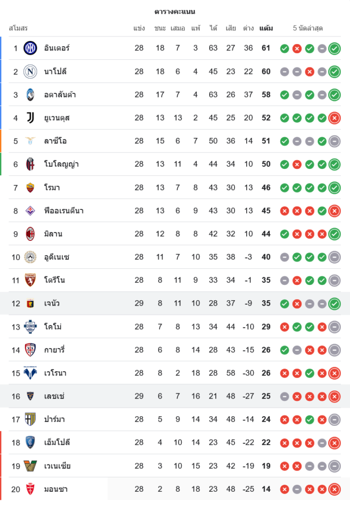ชัยชนะของ เจนัว ทำให้พวกเขาขยับขึ้นมาอยู่อันดับที่ 12 มี 35 คะแนนจาก 29 นัด ส่วน เลชเช่ ยังต้องดิ้นรนหนักเพราะรั้งอันดับที่ 16 มีเพียง 25 คะแนนจาก 29 นัด ซึ่งอยู่ใกล้โซนตกชั้นเพียงแต้มเดียว หากไม่สามารถกลับมาเก็บแต้มได้เร็วๆ นี้ สถานการณ์จะยิ่งสุ่มเสี่ยงขึ้นไปอีก