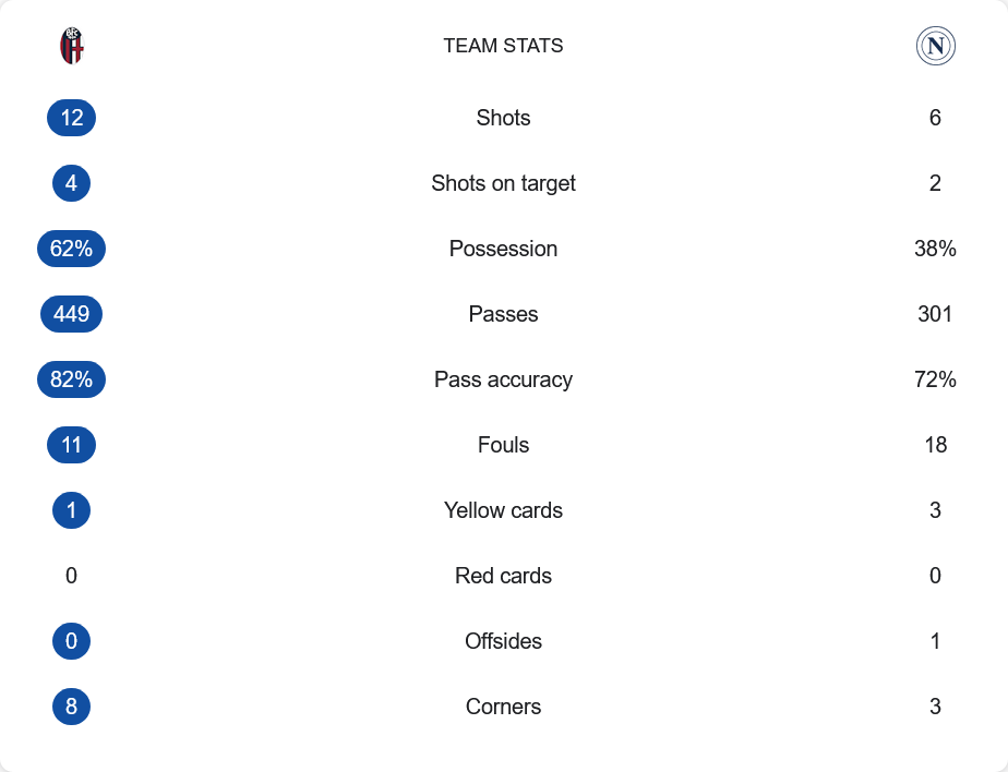 การครองบอลของ นาโปลี อยู่ที่ 52% ซึ่งแสดงให้เห็นถึงการพยายามควบคุมเกมและสร้างโอกาสจากการเล่นผ่านบอลที่แม่นยำ (448 ครั้ง ด้วยความแม่นยำ 83%) ขณะที่ โบโลญญ่า เล่นด้วยสไตล์การเข้าปะทะที่แข็งแกร่ง และการใช้โอกาสที่มีให้เกิดประโยชน์สูงสุด
