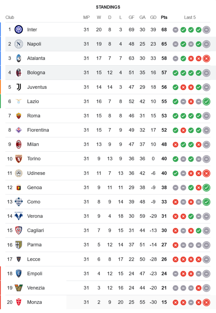 การเสมอในเกมนี้ทำให้ โบโลญญ่า เก็บได้ 66 คะแนน จาก 28 นัด ยังคงอยู่อันดับที่ 2 ของตาราง โดยตามหลัง เบนฟิก้า ที่มี 68 คะแนน เพียง 2 คะแนนเท่านั้น ส่งผลให้การลุ้นแชมป์ยังคงเข้มข้นต่อไป