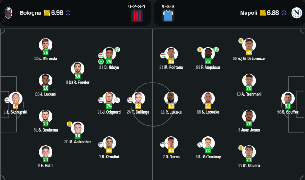 ฟรานซิสโก้ ตรินเคา (โบโลญญ่า) ได้รับการยกย่องให้เป็นผู้เล่นยอดเยี่ยมในเกมนี้ ด้วยคะแนนสูงสุดที่ 7.9 จากการสร้างสรรค์โอกาสให้กับเพื่อนร่วมทีมอย่างต่อเนื่อง และมีบทบาทสำคัญในเกมรุกของ โบโลญญ่า ที่คอยกดดันแนวรับของ นาโปลี ตลอดทั้งเกม การเล่นที่คล่องตัวและความสามารถในการจ่ายบอลที่แม่นยำทำให้เขาโดดเด่นอย่างชัดเจน