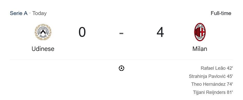 อูดิเนเซ่ปรับเกม เปลี่ยนผู้เล่นหลายตำแหน่งเพื่อหาโอกาสตีไข่แตก แต่กลายเป็นว่าช่องว่างแนวรับยิ่งเปิดให้มิลานเข้าโจมตีต่อเนื่อง นาที 74 แทมมี่ อับราฮัม ที่ลงมาเป็นสำรองทำผลงานทันทีเมื่อจ่ายถวายพานให้ ธีโอ แอร์กน็องเดซ หลุดไปยิงเป็น 3-0 จากนั้นนาที 81 เกมรับเจ้าบ้านโดนเจาะอีกครั้ง คราวนี้เป็น เลเอา จ่ายให้ ติจานี่ เรจน์เดอร์ส ซัดปิดกล่องให้มิลานถล่มขาด 4-0 เก็บชัยชนะสุดโหดจากนอกบ้านได้อย่างเด็ดขาด