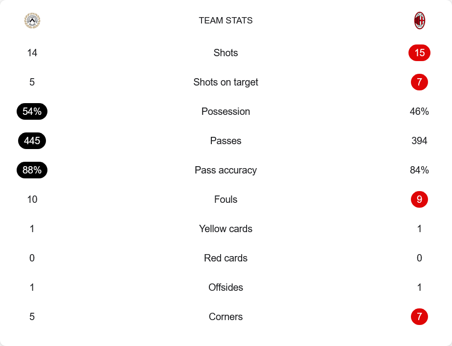 เกมนี้อูดิเนเซ่ครองบอลมากถึง 54% ด้วยจำนวนจ่ายบอลทั้งหมด 445 ครั้ง ความแม่นยำอยู่ที่ 88% ส่วนมิลานครองบอล 46% ผ่านบอล 394 ครั้ง แม่นยำ 84% อย่างไรก็ตาม ความแตกต่างอยู่ที่ประสิทธิภาพในพื้นที่สุดท้าย โดยมิลานยิงรวม 15 ครั้ง เข้ากรอบ 7 ครั้ง และเปลี่ยนเป็น 4 ประตู ขณะที่อูดิเนเซ่แม้ยิงถึง 14 ครั้ง แต่เข้ากรอบแค่ 5 ครั้ง และไม่สามารถเปลี่ยนเป็นสกอร์ได้เลย ทั้งสองทีมฟาวล์รวมกัน 19 ครั้ง และมีใบเหลืองฝั่งละใบ เตะมุม มิลานได้มากกว่า 7 ครั้ง ขณะที่อูดิเนเซ่มีเพียง 5