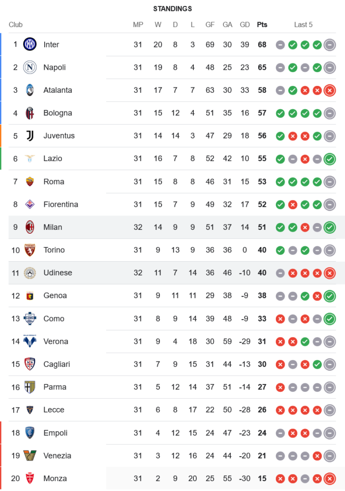 ชัยชนะนี้ส่ง เอซี มิลาน ขยับขึ้นมาอยู่ที่ 9 ของตาราง เซเรียอา มี 51 แต้มจาก 32 นัด ไล่หลังโซนยูโรปาลีกเพียงไม่กี่คะแนน ส่วน อูดิเนเซ่ ยังนิ่งอยู่ที่อันดับ 11 มี 40 แต้มจาก 32 นัด และยังต้องระวังการหลุดจากครึ่งบนของตารางในช่วงโค้งสุดท้าย