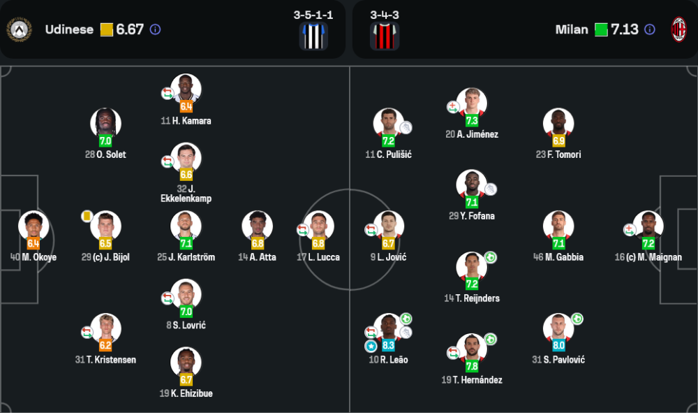 ราฟาเอล เลเอา (8.3 คะแนน) คือทุกอย่างของเกมรุกมิลานวันนี้ ทั้งการจบสกอร์ แอสซิสต์ และการพาบอลขึ้นหน้า เขามีส่วนร่วมโดยตรงถึง 3 จาก 4 ประตู ความเร็ว ทักษะ และการตัดสินใจของเขาคืออาวุธหนักที่อูดิเนเซ่รับมือไม่ไหว สมศักดิ์ศรี “เดอะแบก” ตัวจริง