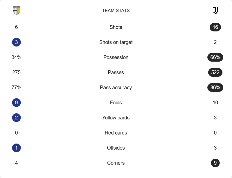 แม้ยูเวนตุสจะครองบอลมากถึง 66% และมีโอกาสยิงรวมถึง 16 ครั้ง แต่กลับเข้ากรอบเพียง 2 ครั้งเท่านั้น ขณะที่พาร์ม่ายิง 6 ครั้ง เข้ากรอบ 3 ครั้ง ซึ่งหนึ่งในนั้นคือประตูชัย ข้อแตกต่างคือประสิทธิภาพและการจบสกอร์ที่เฉียบขาดกว่าในจังหวะสำคัญของเจ้าถิ่น โดยยูเวนตุสยังมีสถิติการผ่านบอลมากกว่า 522 ครั้ง และความแม่นยำสูงถึง 86% แต่ยังขาดไอเดียเจาะแนวรับที่แน่นหนาของพาร์ม่า