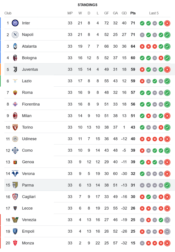 ชัยชนะของพาร์ม่านัดนี้ทำให้ทีมขยับขึ้นมาอยู่ที่อันดับ 15 มี 31 แต้ม ทิ้งห่างโซนตกชั้นเล็กน้อย สร้างความหวังในการอยู่รอดต่อในซีซั่นนี้ ด้านยูเวนตุสยังคงรั้งอันดับ 5 ด้วย 59 แต้ม สุ่มเสี่ยงต่อการโดนลาซิโอและโรม่าที่แต้มเท่ากันแซงขึ้นได้หากสะดุดอีก