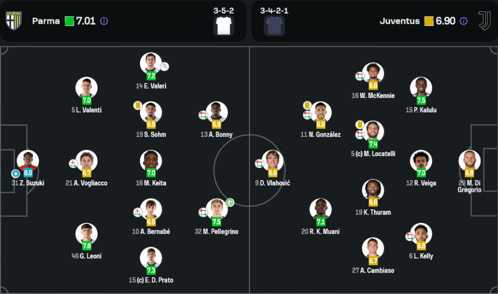 ครึ่งหลังยูเวนตุสเร่งเครื่องหนัก ส่งทั้ง ฟรานซิสโก้ คอนไซเซา, เคนาน ยิลดิซ และทิโมธี เวอาห์ ลงสนามหวังตีเสมอให้ได้ แต่แนวรับของพาร์ม่าที่มี ซิออน ซูซูกิ ผู้รักษาประตูจอมหนึบในวันฟอร์มเทพเซฟลูกยากสำคัญไว้ได้หลายครั้ง รวมถึงกองหลังอย่างโจวานนี เลโอนี และเอ็นโซ ดี ปราโต้ ก็ประคองเกมได้อย่างแข็งแกร่ง ทำให้จบ 90 นาที พาร์ม่ารักษาสกอร์ไว้ได้ คว้า 3 แต้มล้ำค่าแบบหืดจับ