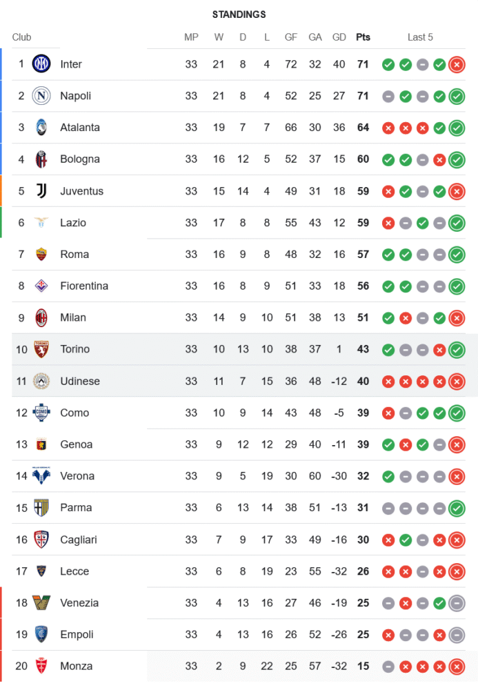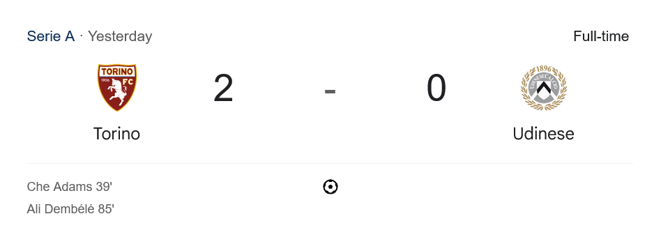 ชัยชนะของโตริโน่ทำให้พวกเขาขยับขึ้นมาอยู่อันดับ 10 ของตารางด้วย 43 คะแนน ห่างจากกลุ่มพื้นที่ยุโรปเพียง 8 แต้ม ขณะที่อูดิเนเซ่ร่วงลงมาอยู่อันดับ 11 มี 40 คะแนน และฟอร์ม 5 นัดหลังสุดแพ้ถึง 4 เกม ซึ่งสถานการณ์เริ่มเข้าสู่โหมดวิกฤต แม้จะยังไม่ถึงโซนตกชั้นแต่ความมั่นใจของทีมลดฮวบอย่างชัดเจน