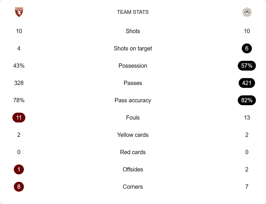 แม้จำนวนการยิงจะเท่ากันที่ 10 ครั้ง แต่ อูดิเนเซ่มีจังหวะยิงตรงกรอบมากกว่าถึง 6 ครั้ง ขณะที่โตริโน่มีเพียง 4 ครั้ง ทว่าเจ้าถิ่นสามารถเปลี่ยนเป็นประตูได้สองลูกเต็ม ๆ ส่วนการครองบอล ทีมเยือนทำได้เหนือกว่าที่ 57% ต่อ 43% และจ่ายบอลมากกว่าถึง 421 ต่อ 328 ครั้ง พร้อมความแม่นยำที่เหนือกว่าเล็กน้อย (82% ต่อ 78%) แต่สิ่งที่ทำให้เกมพลิกคือความเฉียบขาดในการเข้าทำของโตริโน่ที่เหนือกว่าชัดเจน