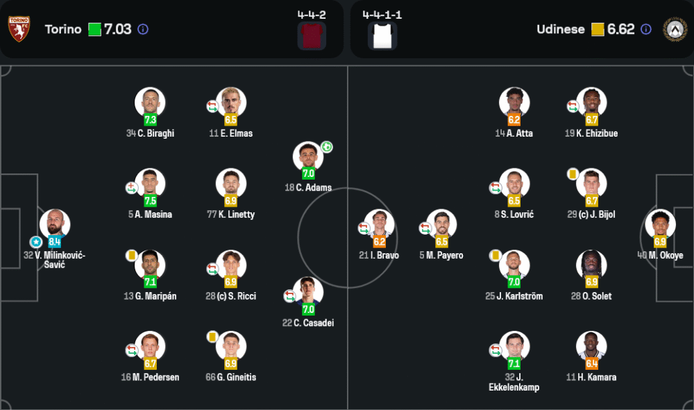 วานยา มิลินโควิช-ซาวิช นายทวารของโตริโน่ โชว์คลาสการเซฟระดับสูงถึง 6 ครั้งตลอดทั้งเกม และเป็นกำแพงด่านสุดท้ายที่ปฏิเสธโอกาสทองของอูดิเนเซ่ได้ทั้งหมด ด้วยคะแนน 8.4 ถือเป็นฟอร์มระดับฮีโร่ที่ช่วยทีมคว้าชัยแบบสุดมัน