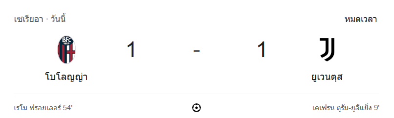 แม้จะออกสตาร์ทเกมได้อย่างเฉียบคม แต่ ยูเวนตุส ก็ไม่สามารถรักษาสกอร์ไว้ได้ หลังโดนเจ้าถิ่น โบโลญญ่า ไล่ตีเสมอในครึ่งหลังแบบดุดัน จบเกมด้วยผล เสมอ 1-1 อย่างมันส์ โดยเกมนี้ถือว่าเป็นอีกหนึ่งแมตช์ที่แฟนบอลตามลุ้น ผลบอลสด กันจนถึงวินาทีสุดท้าย เพราะมีทั้งจังหวะดราม่า ใบเหลือง และโอกาสสำคัญหลายครั้งแบบแทบหายใจไม่ทัน