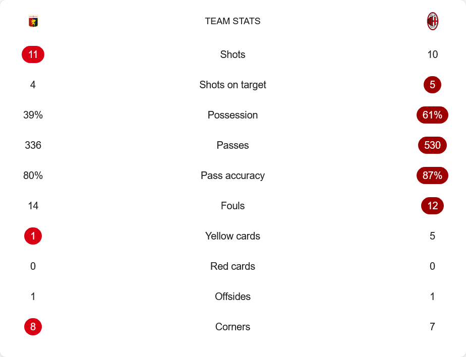 แม้สกอร์จะเฉือนกันเพียงลูกเดียว แต่ภาพรวมมิลานคุมเกมได้เหนือกว่า โดยครองบอลถึง 61% ส่งบอลมากถึง 530 ครั้งด้วยความแม่นยำ 87% เทียบกับเจนัวที่ครองบอล 39% และผ่านบอลเพียง 336 ครั้ง ความต่างในความเฉียบขาดก็ชัดเจน มิลานมีโอกาสยิง 10 ครั้ง เข้ากรอบ 5 ส่วนเจนัวยิง 11 ครั้งแต่เข้ากรอบเพียง 4 และโดนกดดันจนทำเข้าประตูตัวเอง ปัญหาจบสกอร์และความผิดพลาดส่วนบุคคลยังเป็นจุดที่เจนัวต้องรีบแก้