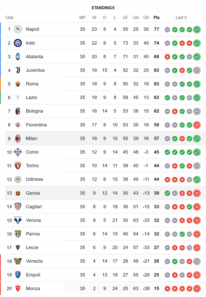 ตาม ตารางบอล นัดต่อไป มิลานจะกลับไปเล่นในบ้านพบกับโบโลญญ่าในวันที่ 10 พฤษภาคมนี้ เวลา 01:45 น. ซึ่งถือเป็นเกมสำคัญที่อาจชี้ชะตาโควตาบอลยุโรป ขณะที่เจนัวจะต้องบุกไปเยือนนาโปลีในวันที่ 12 พฤษภาคม เวลา 01:45 น. ซึ่งเป็นงานหนักสุด ๆ หากยังต้องการเก็บแต้มเพื่อความอยู่รอด