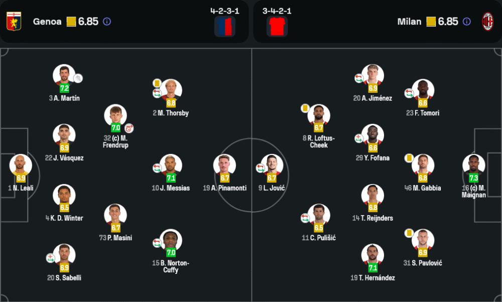 ราฟาเอล เลเอา คือตัวตัดสินเกมอย่างแท้จริง แม้จะถูกส่งลงมาครึ่งหลัง แต่ความเร็วและความมั่นใจของเขาทำให้แนวรับเจนัวปั่นป่วนจนรับมือไม่ไหว เขายิงประตูตีเสมอให้ทีมและสร้างจังหวะกดดันที่นำมาซึ่งประตูที่สองได้ในทันที ด้วยคะแนน 7.8 เขาคือฮีโร่ของเกมนี้โดยไร้ข้อกังขา