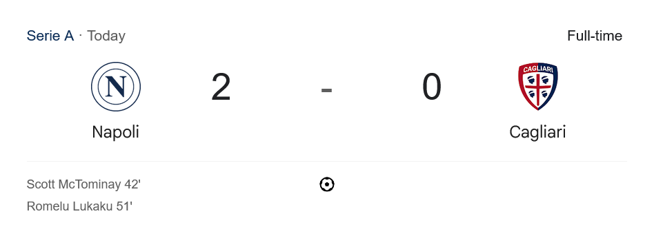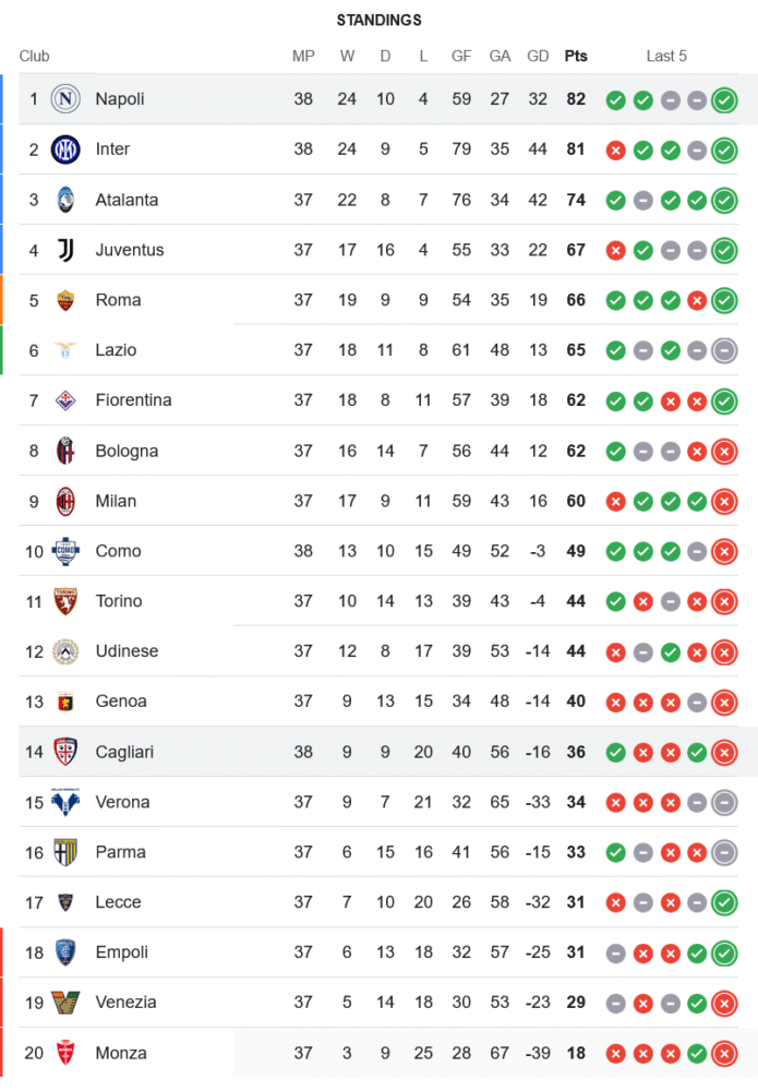 ชัยชนะในเกมนี้ส่งให้ นาโปลีคว้าแชมป์เซเรีย อา ฤดูกาล 2024/25 อย่างเป็นทางการ ด้วยคะแนน 82 แต้ม เฉือน อินเตอร์ มิลาน ที่จบด้วย 81 แต้มไปอย่างระทึก ส่วนทางฝั่งกายารี่ แม้จะแพ้ในเกมนี้แต่ยังคงรอดตกชั้นแบบหวุดหวิด โดยจบอันดับที่ 14 มี 36 คะแนน ทิ้งห่างโซนแดงอย่างเลชเช่และเอ็มโปลีอยู่ 5 คะแนน