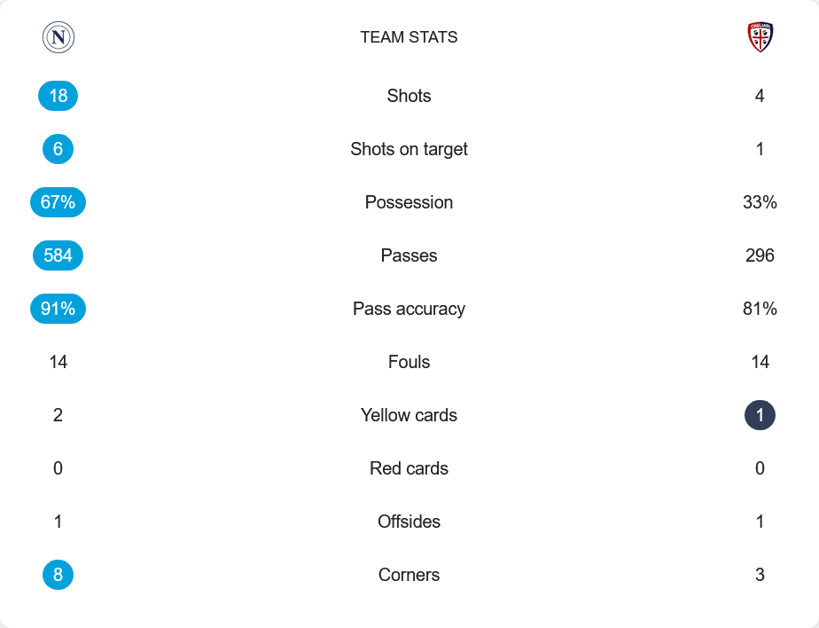 ตลอดทั้งเกม นาโปลีเหนือกว่าทุกด้าน เริ่มจากการครองบอลที่มากถึง 67% เทียบกับ 33% ของกายารี่ โดยทีมเจ้าบ้านผ่านบอลทั้งหมด 584 ครั้ง ความแม่นยำสูงถึง 91% ขณะที่กายารี่ผ่านบอลเพียง 296 ครั้ง แม่นยำแค่ 81% ส่วนจังหวะยิง นาโปลีสร้างโอกาสถึง 18 ครั้ง เข้ากรอบ 6 ครั้ง ส่วนกายารี่มีโอกาสเพียง 4 ครั้ง เข้ากรอบแค่ลูกเดียว นอกจากนี้นาโปลียังได้ลูกเตะมุมมากถึง 8 ครั้ง เทียบกับกายารี่ที่ได้เพียง 3 ครั้ง และแม้จะมีฟาวล์เท่ากันที่ 14 ครั้ง แต่เจ้าบ้านโดนใบเหลือง 2 ใบ ขณะที่ทีมเยือนได้รับแค่ 1 ใบ