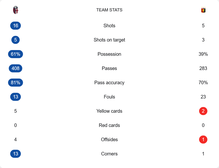 แม้ว่าโบโลญญ่าจะมีเปอร์เซ็นต์การครองบอลมากถึง 61% และผ่านบอลได้ 408 ครั้ง ด้วยความแม่นยำ 81% ขณะที่เจนัวครองบอลเพียง 39% และผ่านบอล 283 ครั้ง ความต่างกลับอยู่ที่ความเฉียบขาด โบโลญญ่ามีโอกาสยิงถึง 16 ครั้ง เข้ากรอบ 5 ขณะที่เจนัวยิงเพียง 5 ครั้ง เข้ากรอบ 3 แต่เปลี่ยนเป็น 3 ประตูเต็ม ส่วนลูกเตะมุมเป็นโบโลญญ่าที่ทำได้ถึง 13 ครั้ง ขณะที่เจนัวมีเพียง 1 ครั้งเท่านั้น ด้านฟาวล์และใบเหลือง เจนัวมีฟาวล์มากถึง 23 ครั้งและโดนใบเหลือง 2 ใบ ขณะที่เจ้าบ้านฟาวล์ 13 ครั้งแต่โดนใบเหลืองถึง 5 ใบ