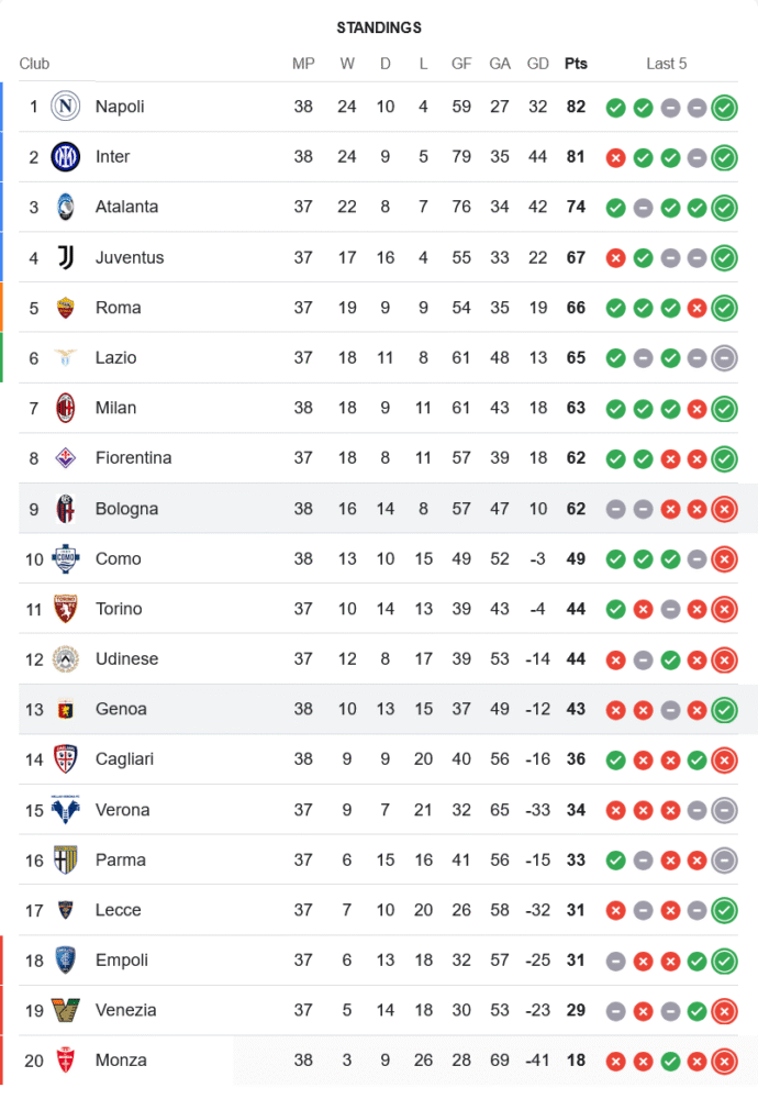 ชัยชนะนัดนี้ทำให้เจนัวจบฤดูกาลด้วย 43 คะแนนจาก 38 นัด รั้งอันดับ 13 ของตารางได้อย่างปลอดภัย ขณะที่โบโลญญ่าซึ่งเคยมีลุ้นท็อป 6 ต้องพลาดหวัง จบที่อันดับ 9 ของตารางด้วย 62 แต้ม นับเป็นบทสรุปที่น่าผิดหวังเล็กน้อยสำหรับทีมของวินเชนโซ่ อิตาเลียโน่ ที่ฟอร์มตกในช่วงท้าย
