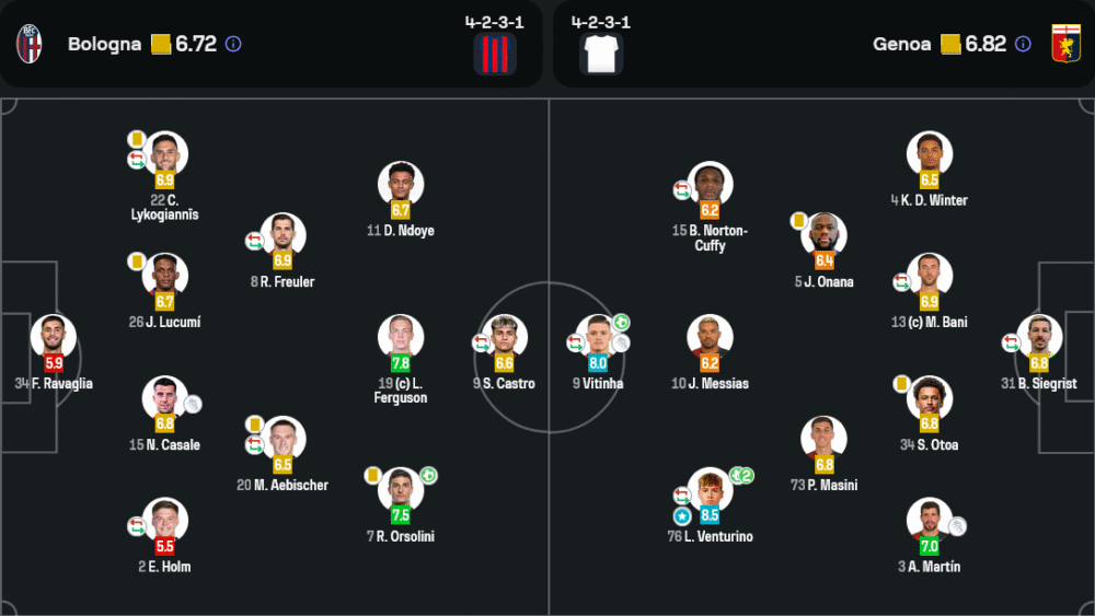 ลอเรนโซ่ เวนตูริโน่ ปีกซ้ายของเจนัวคือผู้เล่นยอดเยี่ยมของเกมนี้แบบไร้ข้อกังขา ด้วยคะแนน 8.5 จากการยิงคนเดียว 2 ประตูในครึ่งแรก บวกกับความเร็วในการเจาะแนวรับเจ้าบ้านที่ทำให้แนวรับโบโลญญ่าปั่นป่วนอย่างหนักตลอดทั้งเกม