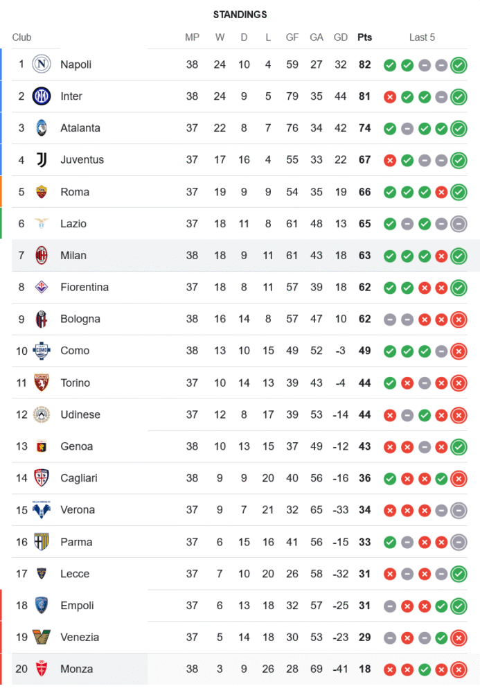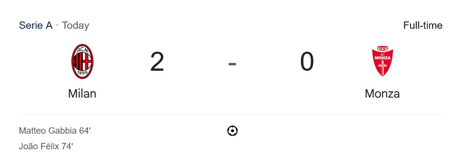 จากชัยชนะนัดนี้ ส่งผลให้ เอซี มิลาน ปิดฤดูกาลด้วยอันดับ 7 บนตาราง มี 63 คะแนน ตามหลังโซนยูโรป้าลีกเพียงเล็กน้อย ขณะที่ มอนซ่า ต้องยอมรับชะตาตกชั้นในฐานะบ๊วยของตาราง หลังเก็บได้เพียง 18 แต้มจาก 38 นัด และชนะแค่ 3 เกมตลอดฤดูกาล ถือเป็นฤดูกาลที่ต้องลืมของลูกทีม อเลสซานโดร เนสต้า