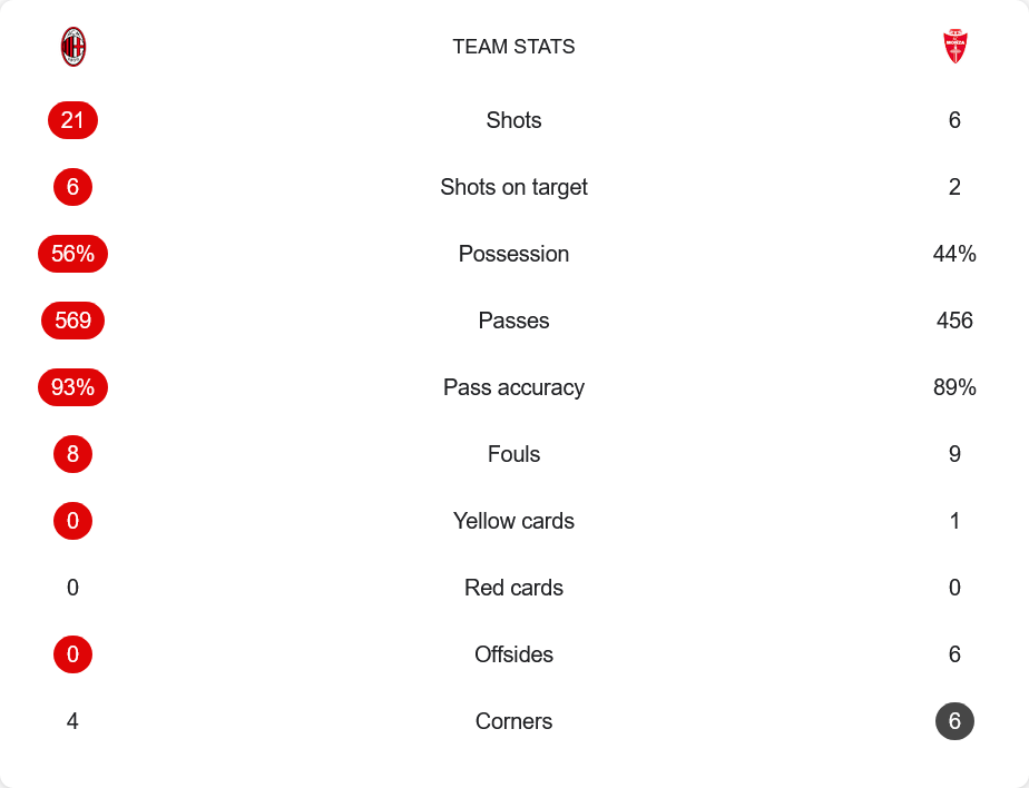มิลานครองบอลอยู่ที่ 56% เท่านั้น แต่พวกเขาสร้างโอกาสยิงได้ถึง 21 ครั้ง เข้ากรอบ 6 ครั้ง แสดงถึงประสิทธิภาพในแนวรุกที่เฉียบคมกว่า โดยมีการผ่านบอลทั้งหมด 569 ครั้ง และความแม่นยำสูงถึง 93% ต่างจาก มอนซ่า ที่มีเพียง 6 โอกาสยิง และเข้ากรอบแค่ 2 ครั้ง แม้จะผ่านบอลไปถึง 456 ครั้งก็ตามแต่ไม่สามารถเปลี่ยนเป็นโอกาสจบสกอร์ได้เท่าคู่แข่ง ขณะที่จำนวนฟาวล์ มิลานทำเพียง 8 ครั้ง ส่วนมอนซ่าทำถึง 9 ครั้ง มีใบเหลือง 1 ใบ