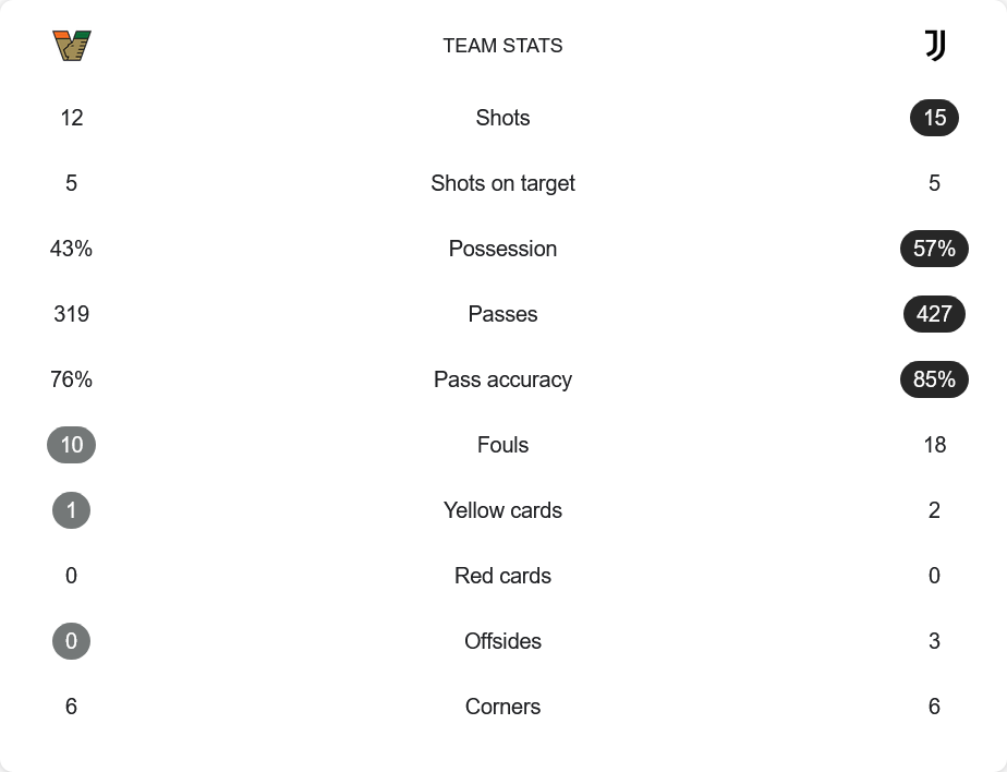 ยูเวนตุสครองบอลมากกว่าที่ 57% ต่อ 43% ของเวเนเซีย และจ่ายบอลทั้งหมด 427 ครั้ง เทียบกับ 319 ครั้งของเจ้าถิ่น โดยมีความแม่นยำในการจ่ายบอลที่ 85% สูงกว่าเวเนเซียที่อยู่ที่ 76% ทั้งสองทีมยิงตรงกรอบเท่ากันที่ 5 ครั้ง แต่ยูเว่มีโอกาสยิงทั้งหมดถึง 15 ครั้ง ขณะที่เวเนเซียมีแค่ 12 ครั้ง ในแง่ของแท็คติก เกมนี้ยูเว่โดนฟาวล์เยอะถึง 18 ครั้ง แต่ก็ไม่ได้มีผลต่อรูปเกมมากนัก ส่วนเวเนเซียมีโอกาสได้เตะมุม 6 ครั้ง เท่ากับยูเว่