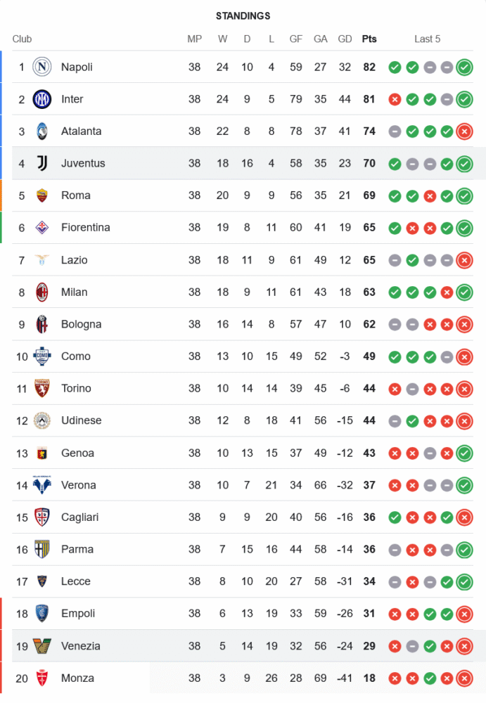 ชัยชนะนัดนี้ส่งให้ยูเวนตุสเก็บเพิ่มเป็น 70 คะแนน จบฤดูกาลด้วยอันดับ 4 ของตารางเซเรียอา คว้าตั๋วไปเล่นยูฟ่าแชมเปียนส์ลีกฤดูกาลหน้าแบบไม่มีลุ้นกันนาทีสุดท้าย ส่วนเวเนเซียแม้จะสู้ได้อย่างสุดมันแต่ก็ไม่เพียงพอที่จะอยู่รอด ตกไปอยู่ในโซนแดงด้วย 29 คะแนน รั้งอันดับ 19 และต้องหล่นชั้นสู่เซเรียบีในฤดูกาลถัดไป